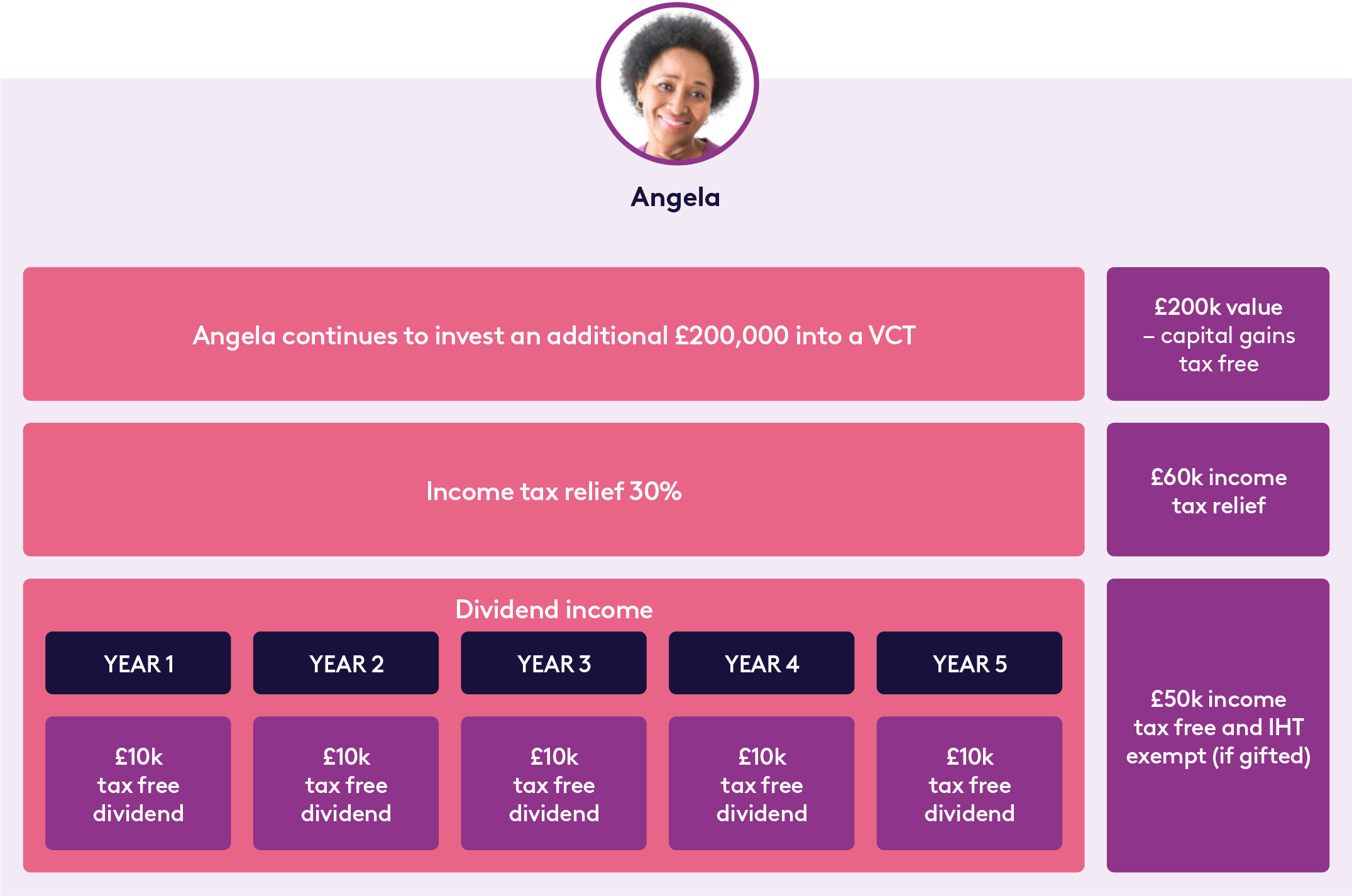 Over the next five years, the VCT targets a 5% dividend each year, potentially providing her with a total of £50,000 in tax-free income over five years.