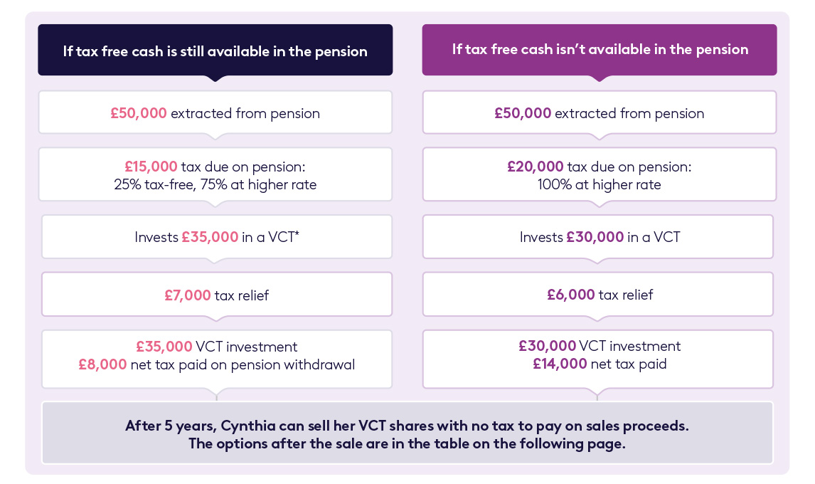 Based on those factors, Cynthia’s adviser suggests withdrawing funds from her pension and using the proceeds to invest in a VCT.