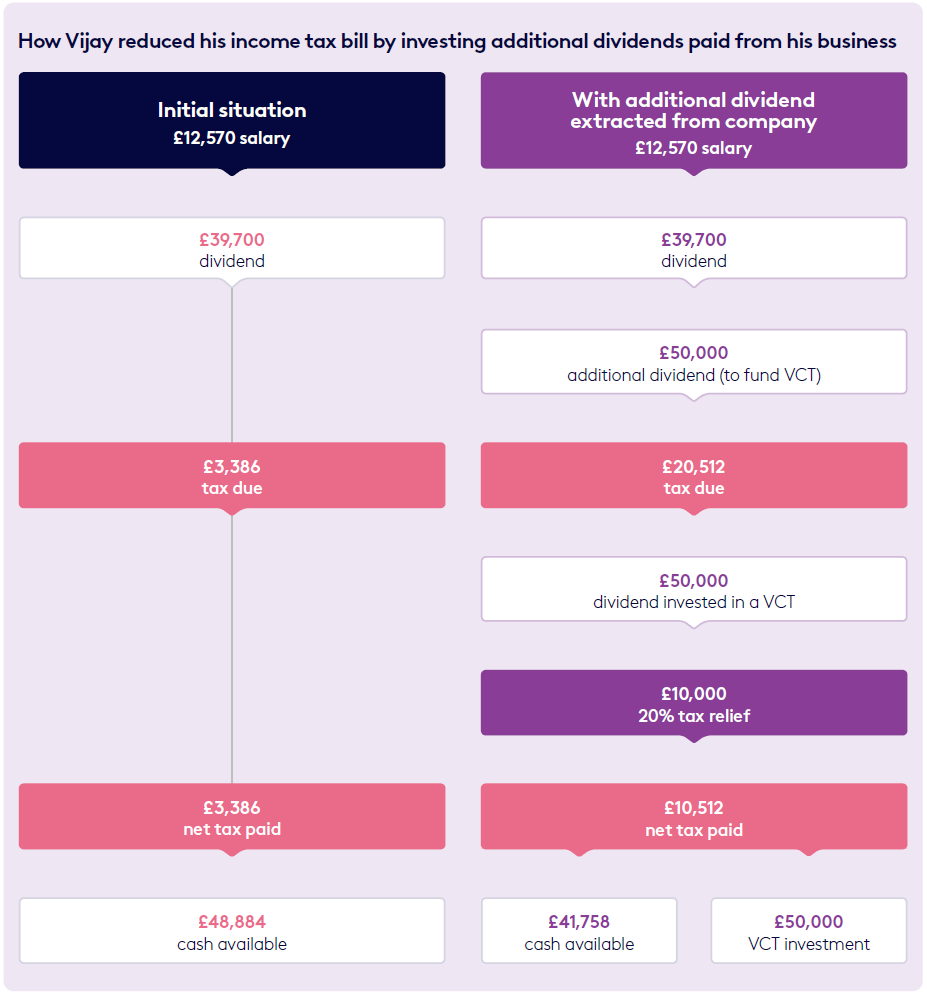 Given Vijay’s goal of extracting surplus money tax efficiently, his adviser suggests that he pay himself an additional £50,000 dividend and invest it into a VCT, holding the investment for at least five years.