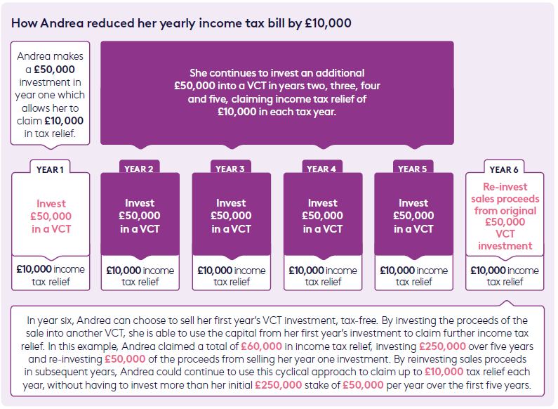 In order to keep the upfront income tax relief claimed, VCT shares must be held for at least five years (should Andrea sell the shares before then, she’d have to repay the tax relief to HMRC). However, after five years, Andrea could sell her first VCT investment, then reinvest any sales proceeds in another VCT and use the additional income tax relief to reduce her year six income tax bill. Similarly, Andrea’s year two VCT investment could be sold and reinvested in another VCT in year seven, giving her additional income tax relief, and so on.